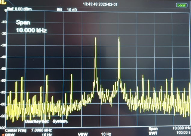 When two audio signals, say at 1kHz and 1.9kHz, are applied then the output to the antenna should comprise two frequencies - one at 7.001MHz and one at 7.0019MHz. How is this possible when the transmitter is only capable of generating one frequency at a time? Well, it turns out that it is possible - by varying both the output frequency and output amplitude in exactly the right way. This can be shown mathematically in my blog post here.